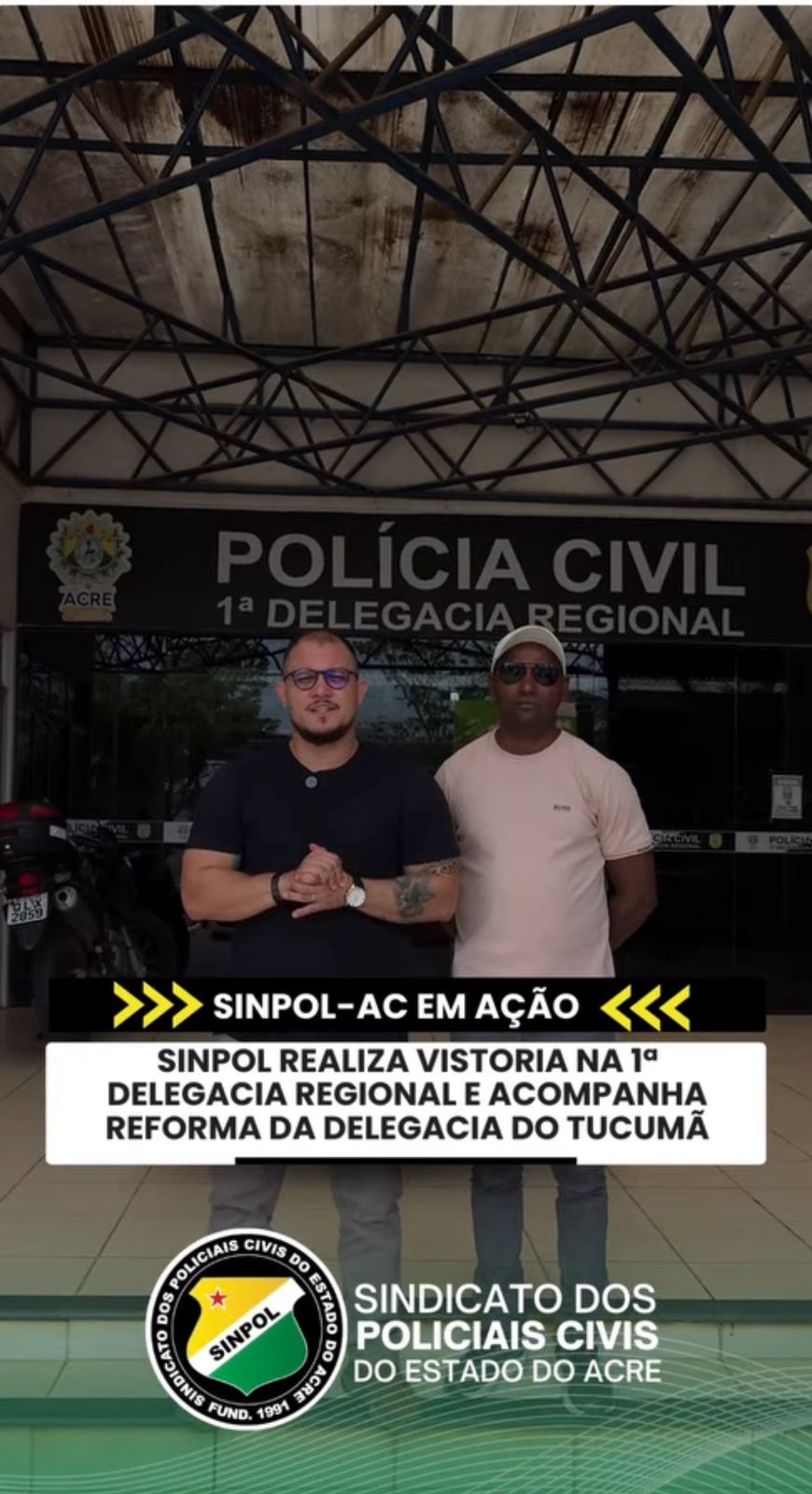 O SINPOL-AC realizou vistoria na 1ª Delegacia Regional e acompanhou a obra de reforma da Delegacia do Tucumã, observando de perto as condições atuais de funcionamento e os avanços estruturais em andamento.