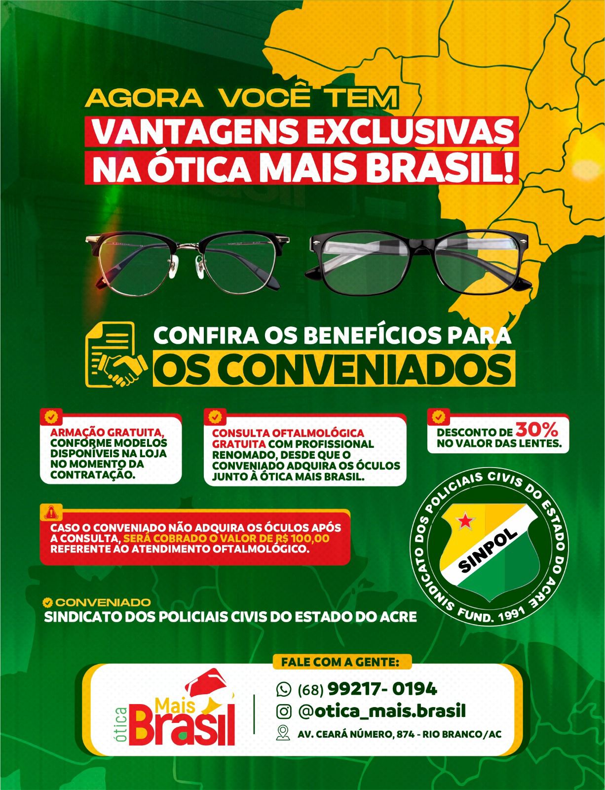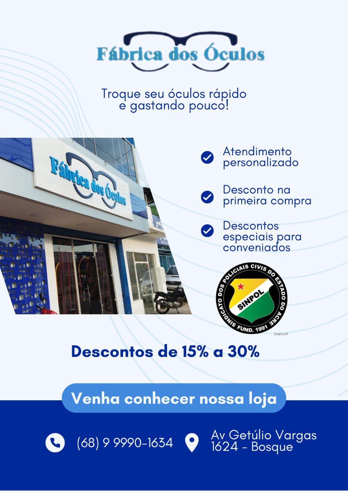 A Ótica Xainã oferece para os associados SINPOL/AC e seus dependentes descontos especiais nas compras em armações e lentes para óculos, nas formas de pagamento abaixo: