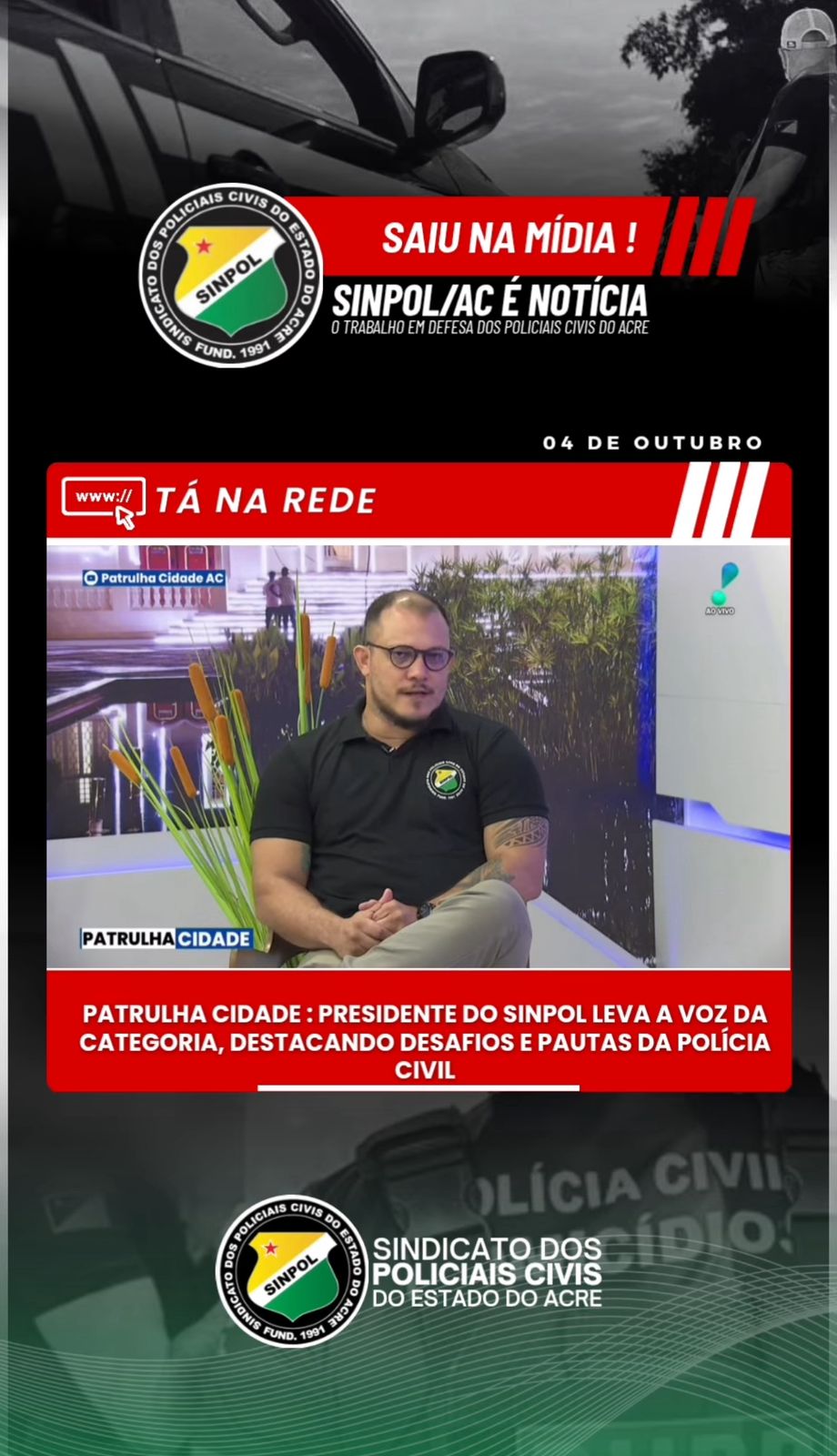O presidente do SINPOL-AC, Rafael Diniz, participou de uma entrevista no programa Patrulha Cidade, onde fez importantes apontamentos sobre a atuação da Polícia Civil, as demandas da categoria e os desafios enfrentados pela segurança pública no Estado.